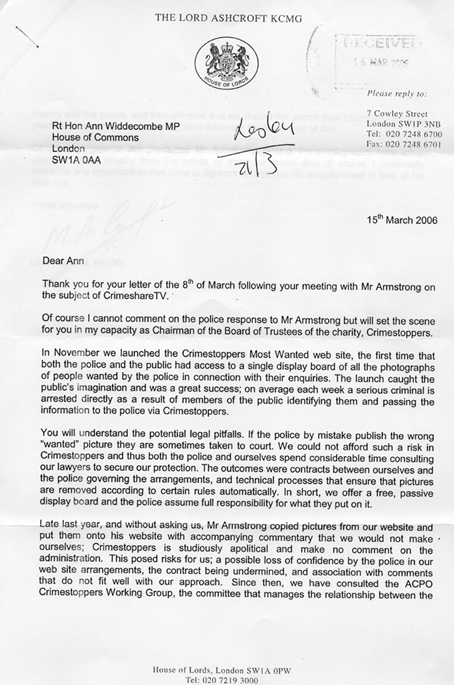 Communication between Anne Widdecombe, Lord Ashcroft and the Police |